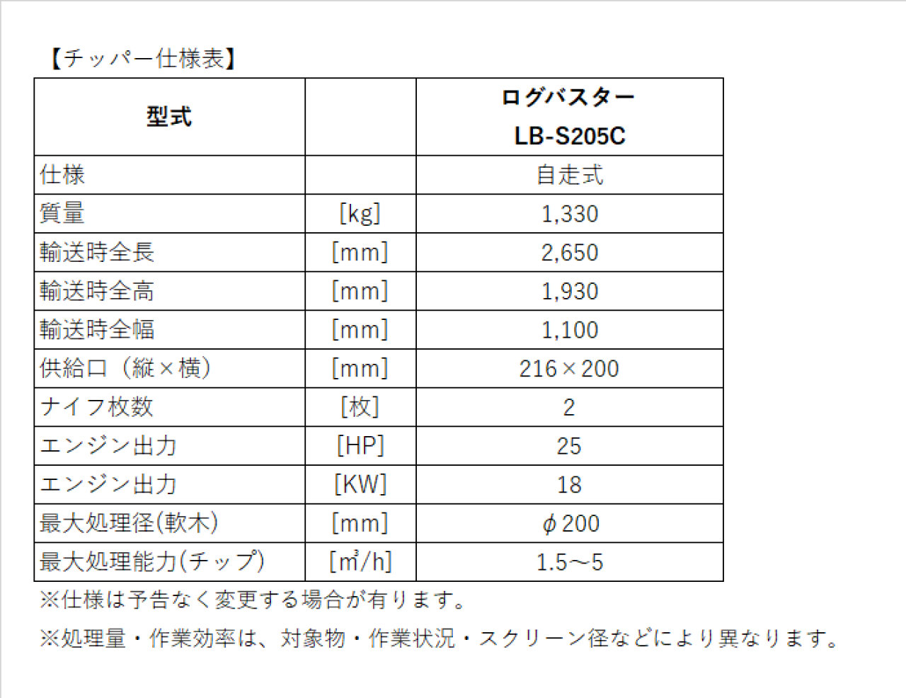 LB-S205Cは小型自走式となっており、2トントラックでの運搬も可能。剪定枝・小丸太・竹に最適な小型木材破砕機です。